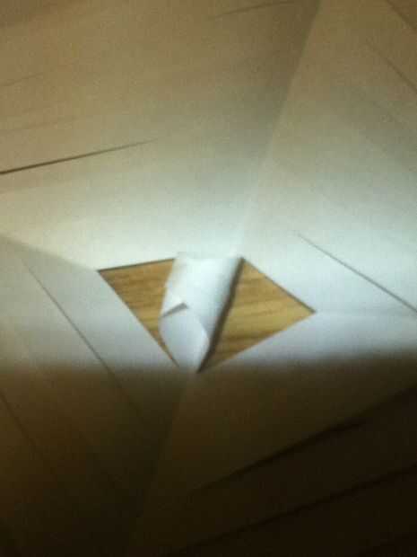 Tomar las aletas del centro y con cinta adhesiva como se ve en la foto. Voltee el papel y hacer lo mismo con la siguiente tapa. Bancos y encintado de las aletas.