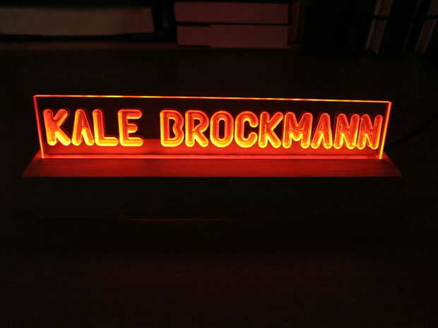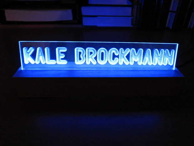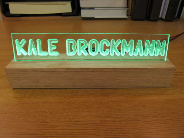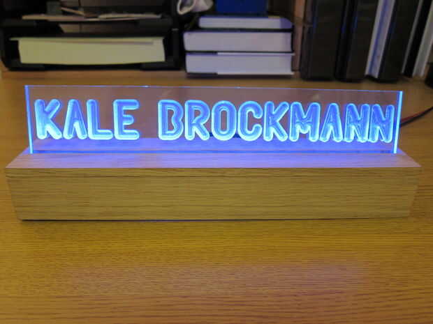 El concepto de este proyecto es simple; grabar un nombre en un pedazo de hoja de plástico transparente y arrojar luz sobre el borde del plástico. Las letras y los bordes claramente se iluminan mientras el material claro sigue siendo completamente transparente.