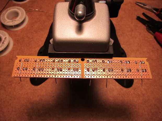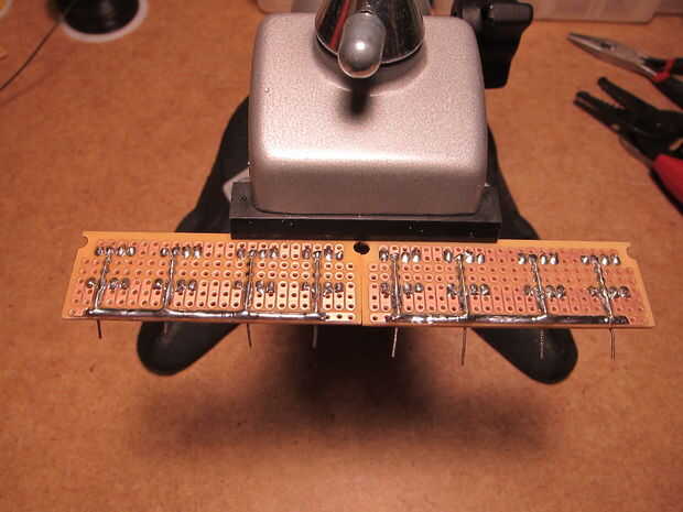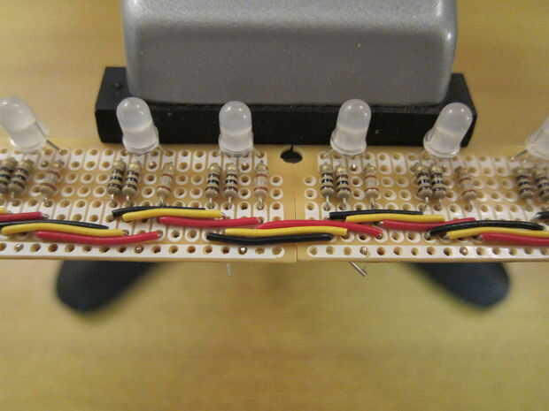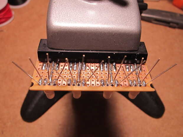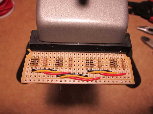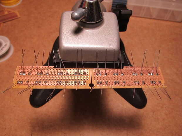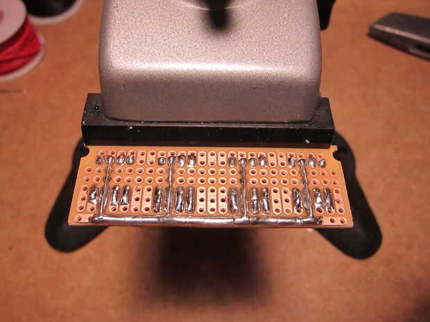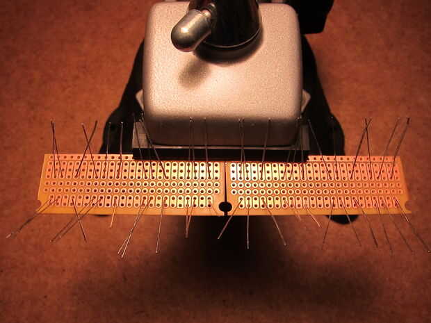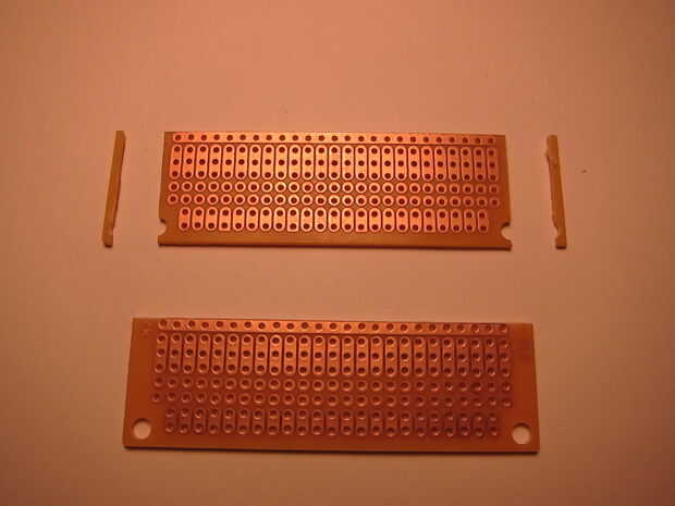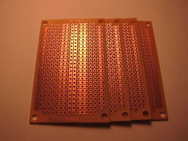 1) circuitos Radioshack cortar por la mitad. La placa de circuito de Radioshack no es simétrica, por lo que ambos lados no se puede utilizar en el mismo proyecto. El medio a utilizar es 8holes x 25holes (ver fotos abajo). Para cortar el tablero por la mitad, puntuación de ambos lados de la junta con el cuchillo a lo largo de la regleta que funciona longitud sabio del lado de la placa que va a ser desechada. Utilice el borde de una mesa para romper el tablero a lo largo de la línea anotada. Luego, use una herramienta rotatoria de alta velocidad Dremel para moler el color de borde en la regleta longitudinal restante.