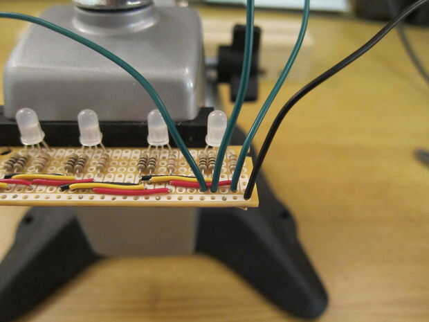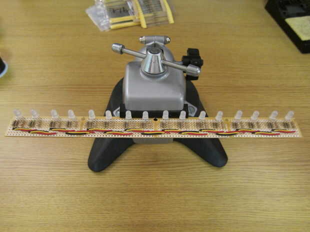 5) soldadura LED en lugar. ¡ Lugar LED en posición correcta, observando la polaridad correcta del diodo. Los nombres de los conductores se indican en un cuadro abajo. Sueldan en lugar mantener el eje vertical de la perpendicular de LED en la parte superior del tablero del circuito. Recortar puntas extendidas.