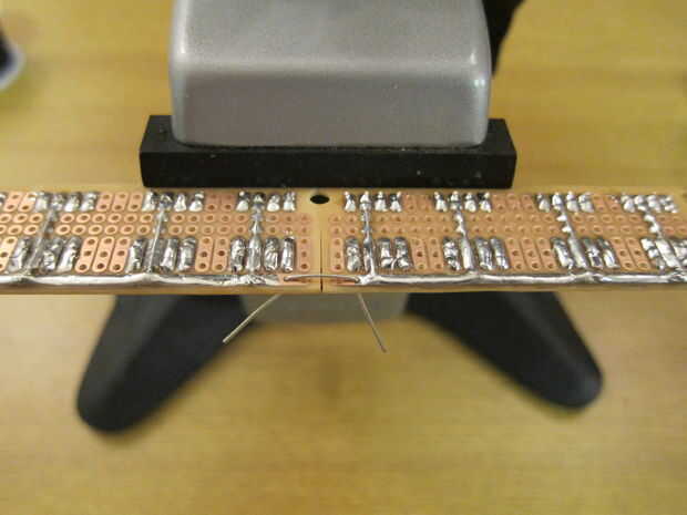 4) puente de soldadura de los cables en su lugar. Cortar a la longitud y el aislamiento de la tira de los extremos de los cables de cobre sólido de 22AWG. La soldadura en lugar de tender un puente sobre los nodos especificados. Recortar puntas extendidas.