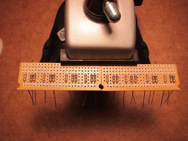 3) de la soldadura de resistencias en su lugar. Doble las puntas para que se encajan entre los lugares indicados en el modelo de CAD en la foto a continuación. Coloque resistentes a las en sus respectivas posiciones como se indica, en lugar de la soldadura y recortar las puntas.