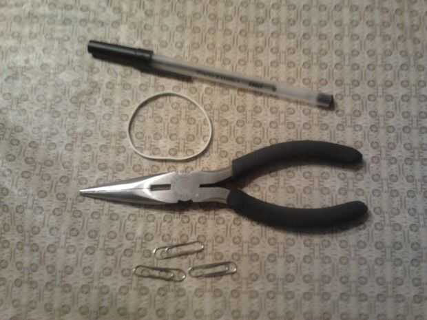 Papel mate pluma, 3 clips de papel pequeñas, alicates y 1 banda de caucho.