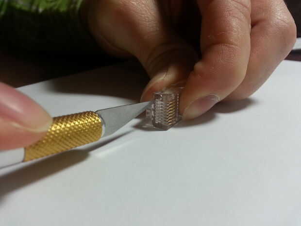Para ello, sujete el conector como se muestra en la primera foto en esta sección y con la otra mano, colocar la punta de la cuchilla X-acto en la plástica delante de la ranura de la parte superior. En este punto, su cuchillo X-acto debe ser casi paralelo a la mesa de que trabajo. Para cortar a través, no empuje la cuchilla X-acto hacia la cara. En cambio, poco a poco aplicar una cantidad creciente de presión hacia abajo en la cuchilla (hacia la mesa) hasta que se deslice hacia abajo un poco, esculpiendo una pequeña pieza de plástico. Repita esto hasta que la hoja pasa a través de la fina capa de plástico.