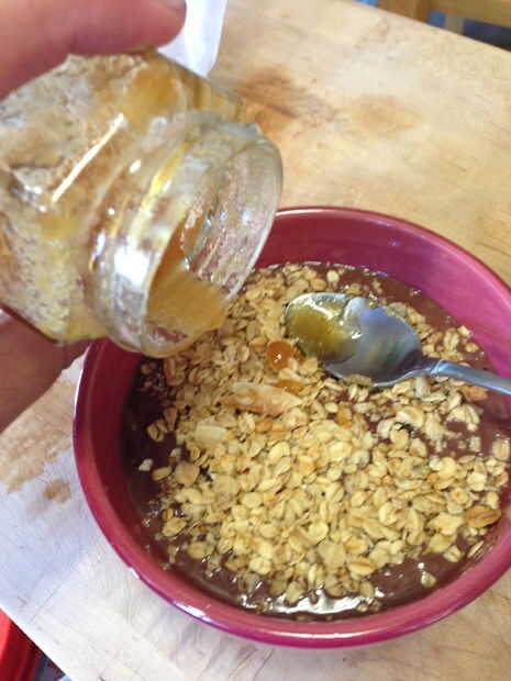 Una vez que se mezcla la mezcla de plátano/jugo/acai, estás casi allí. Vierta la mezcla en un tazón y tapa con el resto de ingredientes. Me gusta hacer granola en primer lugar, seguido por la miel y luego finalmente con fresas otro bayas/plátano rebanadas si lo desea.