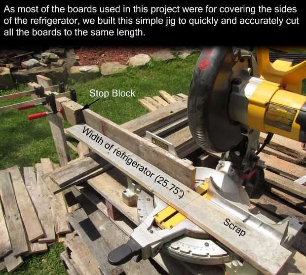 Una vez que los palets se desmantelaron, el siguiente paso fue tramitar las placas de cubierta para que fueran 25,75" largo (el ancho del refrigerador. Para ello para que hemos reunido una guía rápida la cop vi que nos permitió indexar rápidamente las tablas con la longitud correcta para que toda la madera podría ser procesado en forma más eficiente posible. Nos dejó también unos tableros de cubierta sin cortar para que sea lo suficiente para recortar la pieza en un paso posterior.