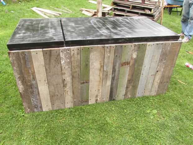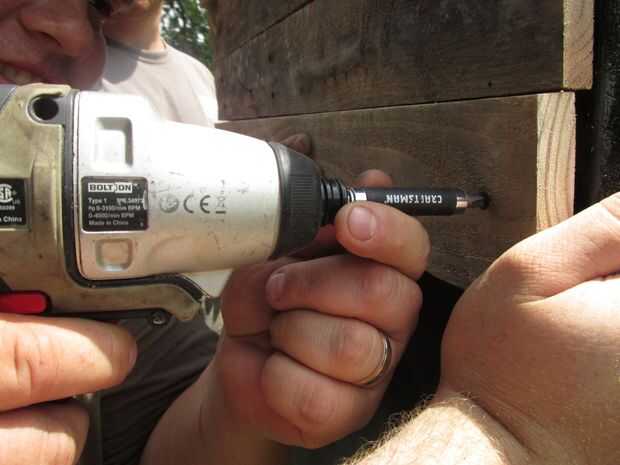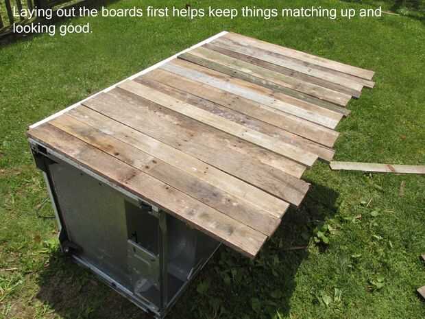 Con la heladera pintada de negro, el siguiente paso fue comenzar cubriendo los lados, superior e inferior de la nevera con la madera reciclada de palets. Empezamos por la colocación de los tableros de corte de la plataforma para ver cómo se encajan en el lado del refrigerador. Que hace que ellos encajan y que todo parece bueno, toman un poco de tiempo como parte de la plataforma de tablas que se encajan como rompecabezas piezas. Una vez que todo se veía bien empezamos a colocar las juntas utilizando una combinación de líquido clavos y tornillos para madera de 1 1/4". Los tornillos fueron tiempo suficiente para ir a través de la envoltura exterior del refrigerador, pero no tanto que le pinche el interior más fresco del compartimento, los tornillos también siempre sujeción de presión para asegurar una buena adhesión entre el líquido clavos, madera y refrigerador.