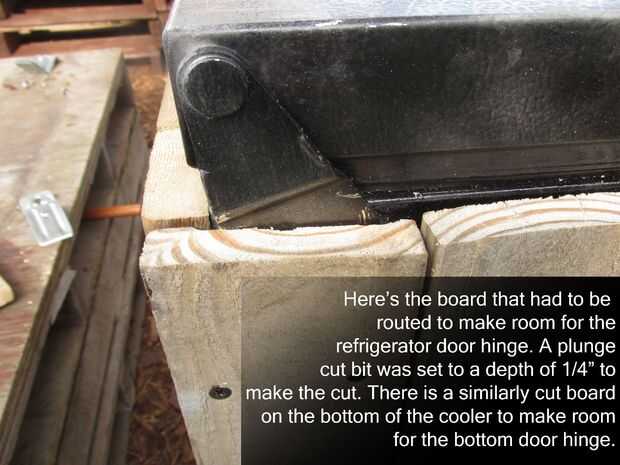 La parte superior y los lados del refrigerador fueron muy fáciles de cubrir con madera, (sólo pequeño colgar fue acomodar la puerta de bisagra en la parte superior del refrigerador que requiere un poco de trabajo router para hacer una de las juntas queden bien). La parte inferior del refrigerador demostró para ser un poquito más de trabajo ya que había algunas partes de él con 2 "X 4" s del capítulo antes de que podríamos añadir el revestimiento de madera de palet.
