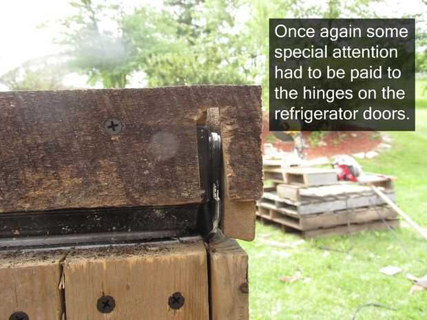 Que cubren las puertas de la nevera con la madera es bastante similar a cubrir los lados con la única diferencia real es que tarda un poco más mano de obra para mantener todo aspecto agradable. Empezamos cubriendo los bordes de las puertas, corte las piezas para que fueran más de lo necesario para ser de 3/4". Esta anchura adicional trabajado para ocultar los bordes de corte de las 3/4" espesor plataforma juntas que se utilizan para cubrir las caras delanteras de las puertas. Por último una vez que las caras frontales y los bordes estaban cubiertas, corte tableros fueron agregados a lo largo de los bordes de las puertas a todo un aspecto acabado.