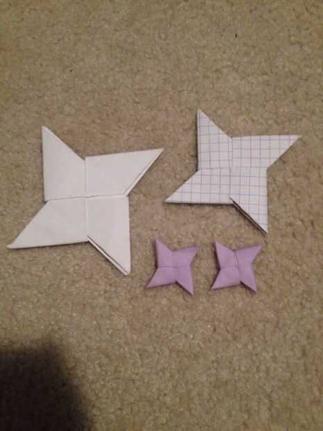 este shuriken de papel tarda más en hacer, requiere de más papel para hacer y no es tan robusto como el shuriken de papel estándar de 4 lados, pero parece mucho más impresionante. Lo malo de este shuriken es su dificultad para lanzar ya que se convie