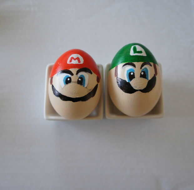 Para hacer el Mario y Luigi, pintar dos duros con el matiz de titanio sin blanquear. Repita el proceso dos veces. Espere al menos 1 hora para secar. A continuación, utilizando un lápiz, dibujar sus rostros en los huevos. Utilice pintura en consecuencia para llenar en cejas, bigote, etc.. Use el lápiz de pintura rotulador blanco para las pupilas y la pluma de pintura azul para el contorno azul de los ojos.