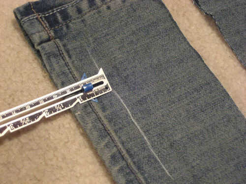 En los pantalones vaqueros que han tenido acabados especiales aplicadas (como el 98% de los pantalones vaqueros disponibles) es típicamente una línea oscura sobre el dobladillo original. Utilizar la tiza (o cualquier herramienta de marca tiene) para dibujar una línea 1/2 pulgada por encima de esa línea oscura. Que la línea oscura ayudará a ocultar la costura donde enlaza con el viejo dobladillo a los pantalones.