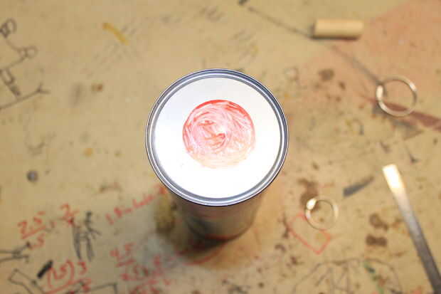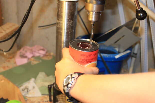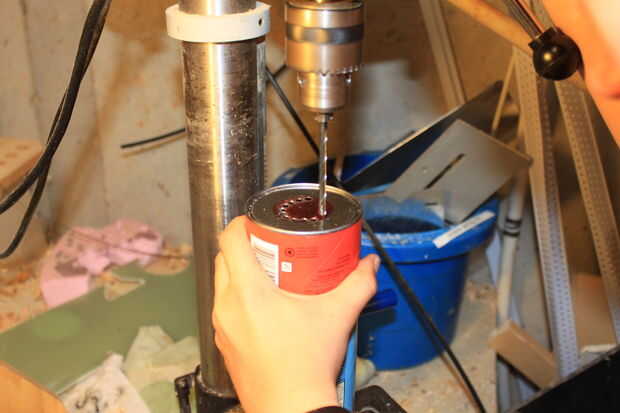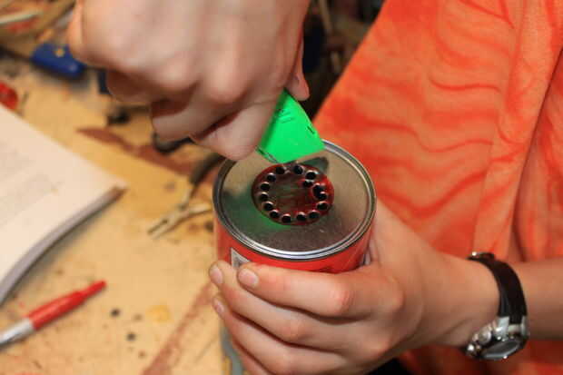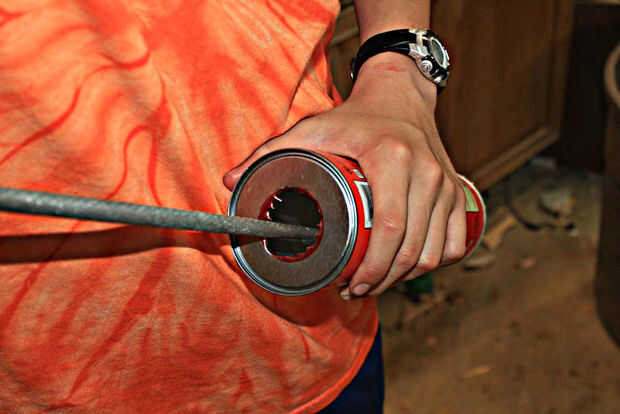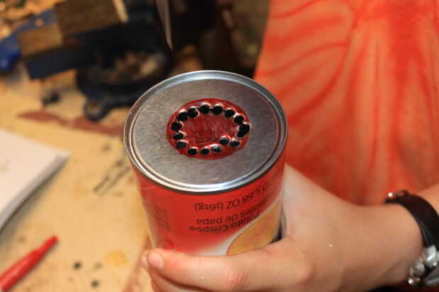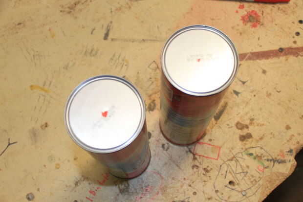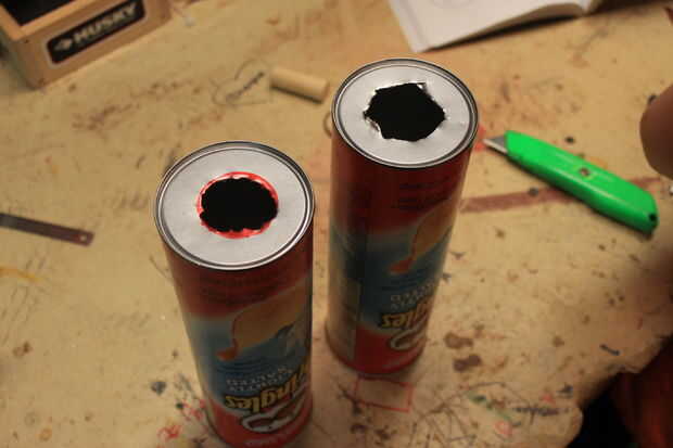 Toma ahora que las otras dos Pringles latas y hacer a que el deflector el propósito de deflectores es a la) evitar bola de a cámara de combustión. Debe ser aproximadamente la mitad de la zona inferior. Mis círculos eran aproximadamente 1 y 1/2 pulg. Para hacer el bafle simplemente encontrar el centro de poder. Luego usando una brújula, o simplemente buen juicio, marca el 1 y 1/2 en el agujero, cortar este orificio es difícil pero si taladra un montón de agujeros en el anillo exterior se puede sólo pop hacia fuera más adelante.