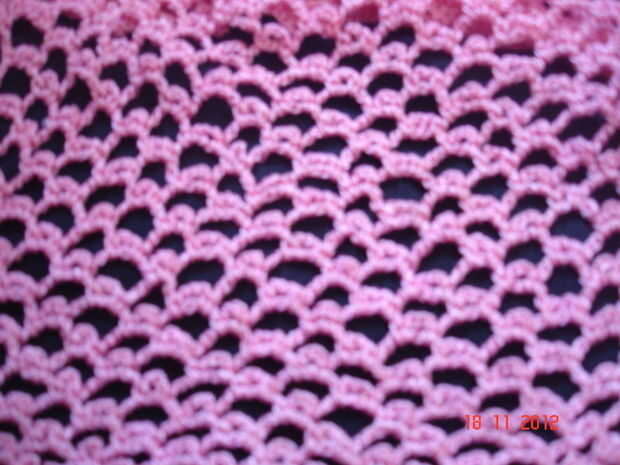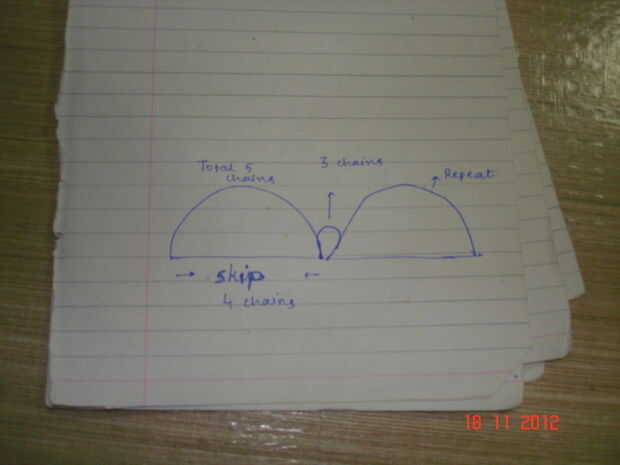 Fila 3: solo ganchillo en la primera cadena, 5 cadenas, saltar 4 cadenas, solo Crochet en Quinta cadena Luego 3 cadenas y solo ganchillo en la cadena siguiente (Imagen adjuntada) Completar la fila. Repetir en el mismo extremo hasta de patrón.