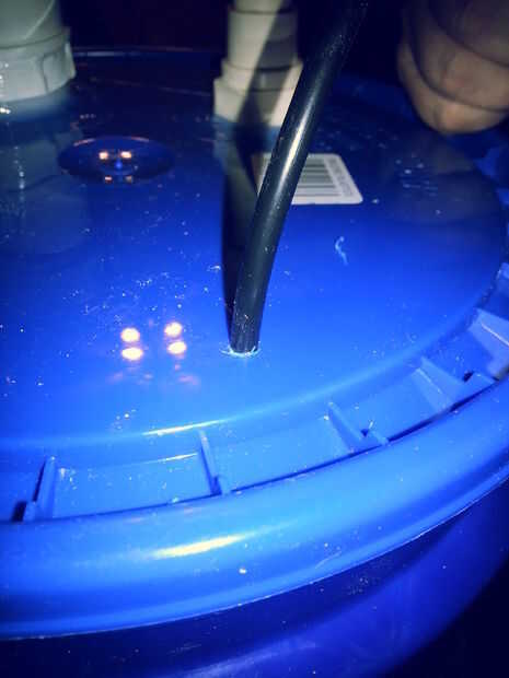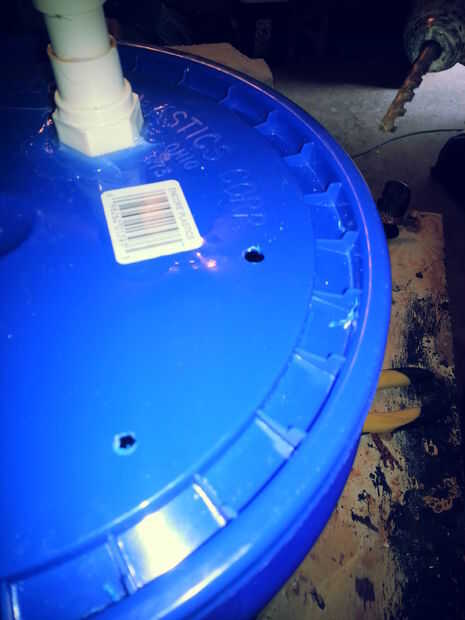 Utilice una mechas que es aproximadamente el mismo tamaño que el tubo. Es mejor ir a un tamaño más pequeño por lo que el tubo quede ajustado en la tapa del cubo. Perfore un agujero a través de la tapa del cubo y enrosque la tubería de goteo a través de ese agujero. Luego cambiar a pedacitos para uno que es aproximadamente el mismo tamaño que el cordón eléctrico de las bombas. Perfore un agujero de unos poquitos en alrededor de la tapa del cubo, como se muestra.