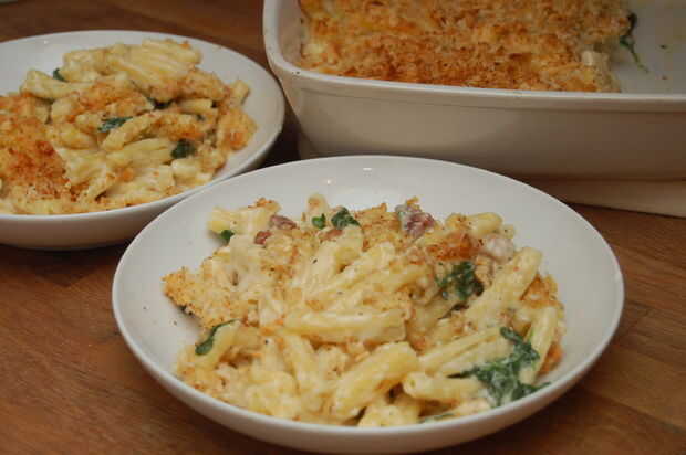 a la idea de este plato que me hace feliz. Salsa suave, queso y crema con pedacitos de tocino salado, crujiente con migas crujientes y la 'sana' de la espinaca. Se trata de la última comida para mí y uno de los primeros platos que aprendí a cocinar para mí, aunque en una versión más simple. Si no te gusta bacon/panceta o espinaca dejarla fuera, seguirá siendo super impresionante y delicioso. También no dude en cambiar hasta un poco añadiendo pimientos asados, champiñones, maíz y chiles verdes. Este es un gran plato y cada uno tiene su propia versión de la firma. Aquí es mi favorito actual.