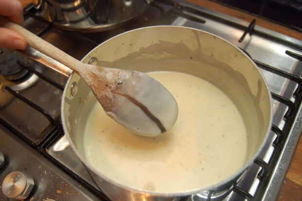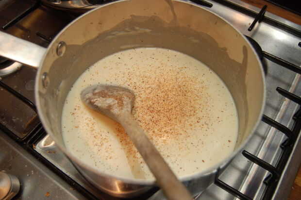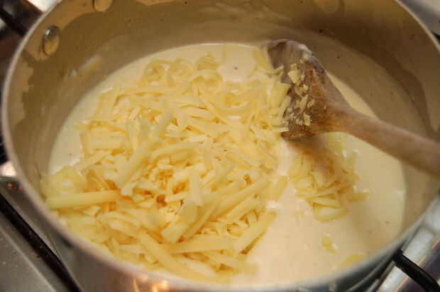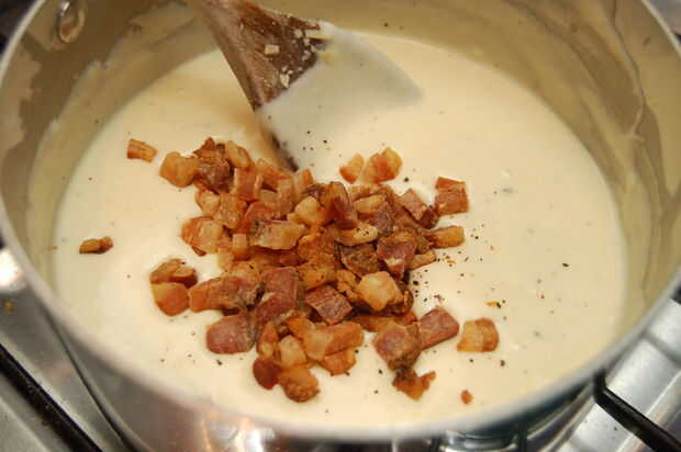 Una vez que haya agregado toda la parrilla de la leche en un poco de nuez moscada y pimienta al gusto y la crema si se utiliza continúen calentar la bechamel hasta ha espesar para que cubra la parte posterior de una cuchara y la harina cruda ha gusto. Apagar el fuego, añadir 2/3 del queso y revuelva hasta que haya derretido en. Agregue ahora a través de sus bacón crujiente.