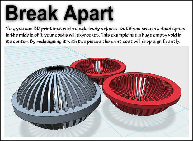 A menudo es más fácil evitar espacios muertos caros si rompe su diseño en partes más pequeñas. Sí, estos días usted puede diseñar increíbles solo-objetos que eran imposibles de crear en pocos años - y su proveedor de impresión será feliz imprimir - espacio muerto y todos. Y te cobran por cada pulgada cúbica de espacio.