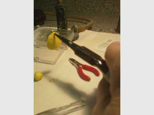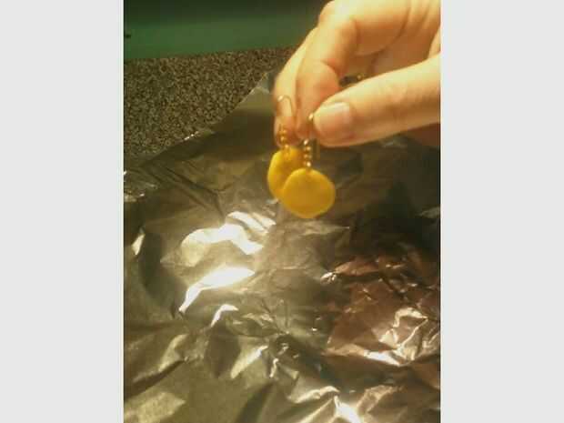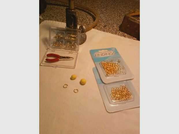 Abrir el anillo del salto y lo puso a través de un agujero hecho con un palillo dejando el anillo abierto mientras se hornea la arcilla. Terminada la cocción agregar el pétalo al otro anillo del salto el oído gancho o collar anillo de salto y crimp cerrado.