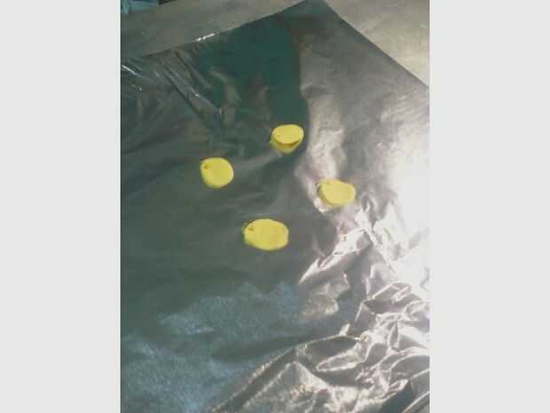 Tome 2 arveja/guisante pequeña tamaño bolas de arcilla de polímero limpio y aplanar ellos uno a la vez. Conseguir que el tamaño y el grosor que desee a continuación hace una huella clara en al menos un lado. Puede tomar varios intentos. a partir de la forma del guisante redondo. una vez que el pétalo, trabajar suavemente y trate de no hacer más copias en la impresión buena.