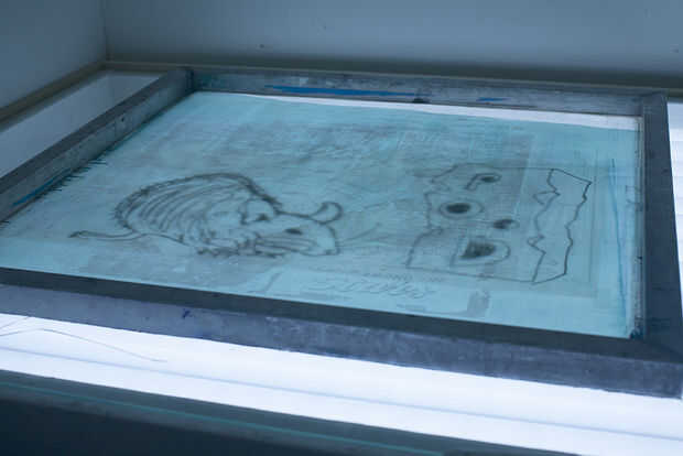 Lugar la película de transparencia (con tu diseño impreso en ella) entre la fuente de luz y la pantalla en la mesa de luz. La emulsión que no es bloqueada por las líneas negras de su diseño se endurece cuando se expone a la luz brillante. Dependiendo de cómo brillante es la fuente de luz, este paso podría tomar de cuatro a veinte minutos. A su vez de la luz cuando haya terminado.