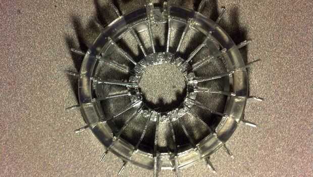 Primero vamos a echar un vistazo en el inferior, diseñé la parte que hay dos claro final, que son los extremos de los apoyos en la parte superior. Comience introduciendo cada segmento individualmente, con un extremo en el soporte, hilo de rosca de la tubería cuidadosamente en las otras ranuras por sosteniendo el otro extremo, va un ángulo de 45 grados debe ser capaces de meter el otro extremo del tubo en el soporte en el lado opuesto del reactor. Hacer este individual usted será capaz de obtener todos los segmentos de 4 en la matriz sin dañarlo, aunque normalmente será el exceso de material dentro de la ranura donde va los LED. No hay que preocuparse, aunque es algo podemos recortar