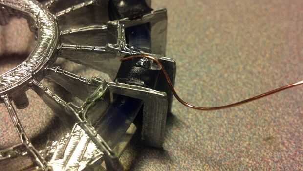Cinta todas las secciones excepto la dos zona donde terminan los conductos de luz, aún tenemos todavía instalar LED. Una vez hecho eso, entonces es tiempo para que el alambre de cobre. Esto es muy tedioso parte al tener que enhebrar el alambre a través de y, muchas veces muchos. En cualquier caso, me comienza por cortar un tramo de 2,6 pies de cable de calibre 30 y arranca el abrigo de un pequeño toque de pegamento caliente y colocar en la parte inferior, (ver foto de referencia). Después de eso, es sólo una cuestión de envolver el alambre alrededor de tantas veces como pueda hasta que poco a nada de la cinta es visible. Enjuague y repita para el otro segmento 7 y estén dorados.