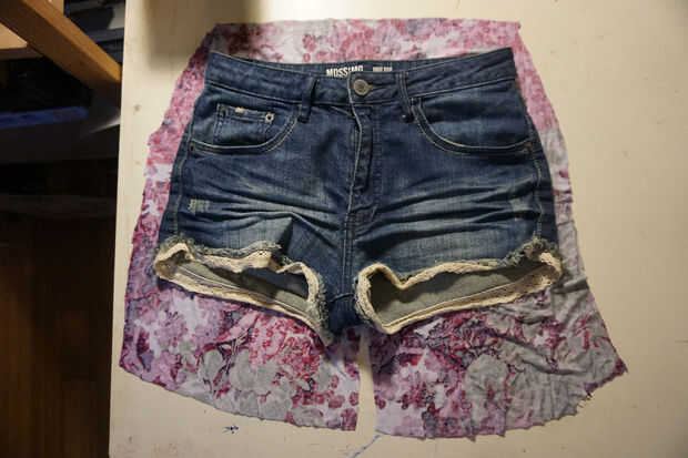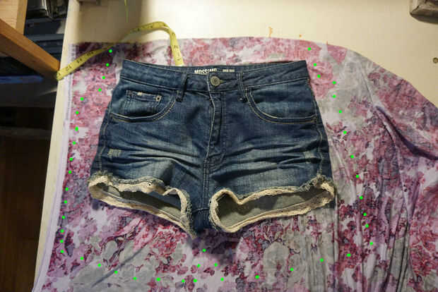 En primer lugar, coloque su tela y extienda sus cortos en la parte superior. Luego cortar un contorno de sus cortos siguiendo los puntos mal ilustrado pixlr (apoyos a quien con éxito puede dibujar cualquier cosa con pixlr) dejando 2 pulgadas en todos los lados pero cortar ligeramente la cintura. Porque la tela es elástica esta manera necesita no elástico para evitar los cortos para arriba cuando usted está usando ellos - los cortos estirará naturalmente cuando usted los usa, manteniendo para arriba. Usted necesitará cortar dos similares.