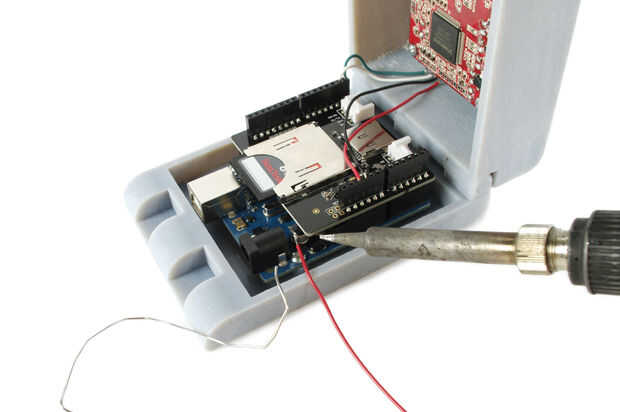 Soldadura un cable rojo a la parte trasera del conector de alimentación de Arduino.