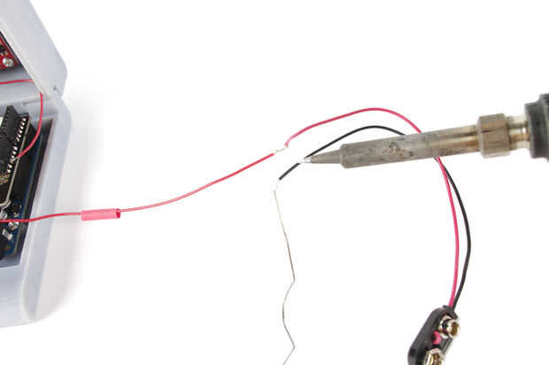 Suelde el cable rojo del conector de alimentación al cable rojo del clip de la batería de 9V.