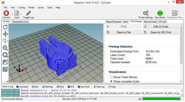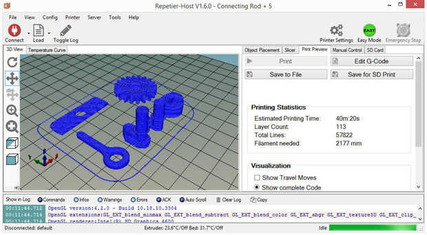 Cada parte fue impreso con una altura de capa de .2mm, relleno de 15%, 2 perímetros, Pilar apoya y velocidades original usando Slic3r y Repetier. Sin embargo, he encontrado el cilindro se beneficia tener una balsa debido a las aletas de enfriamiento tratando de levantar durante las primero 20 o más capas. Todo necesita alrededor de 22 gramos de PLA para imprimir todo el conjunto.