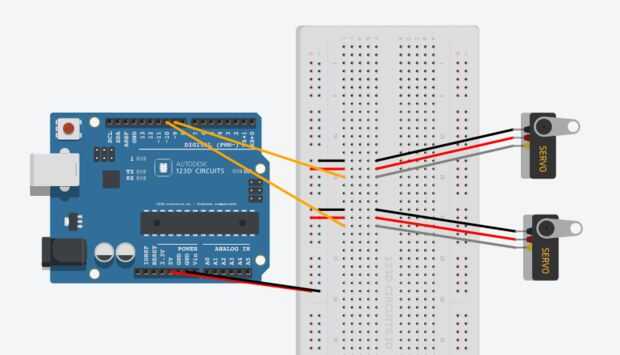 La electrónica es bastante simple, solo conectar los respectivos cables al servo correspondiente y así sucesivamente. Los conectores de servo también tendrá un encabezado de 3 x 1 para conectar a la placa de soldadura-menos. Sólo romper una sección pequeña y conectar.