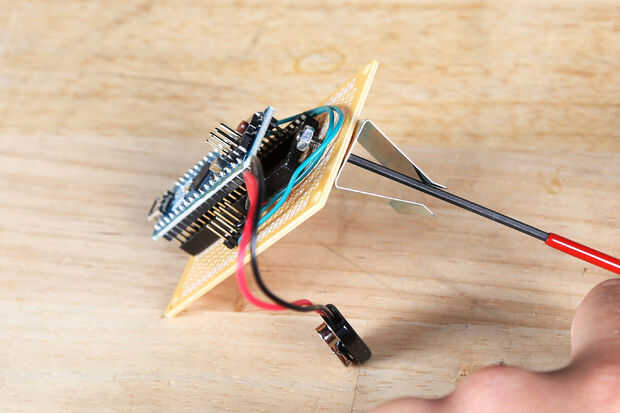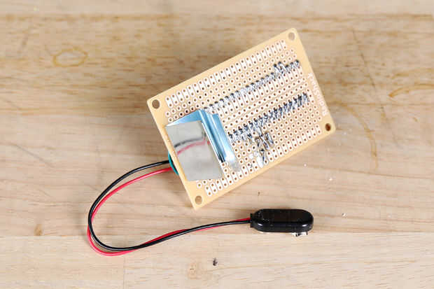 Fije el clip de la batería en la parte inferior del tablero del circuito teniendo cuidado de no cortocircuitar las conexiones eléctricas con él.