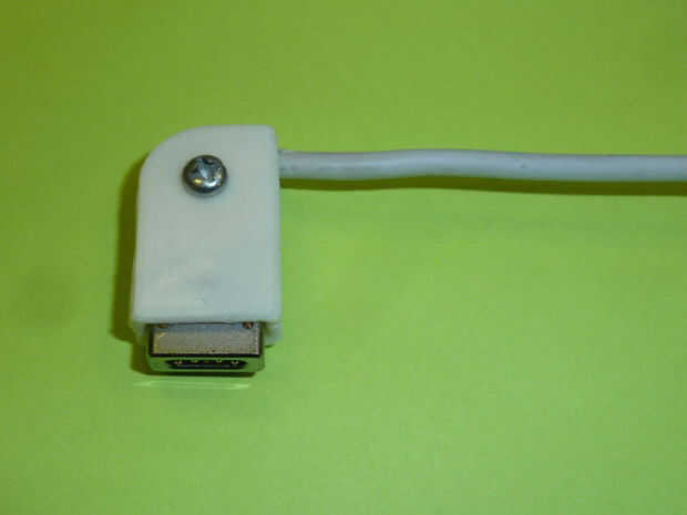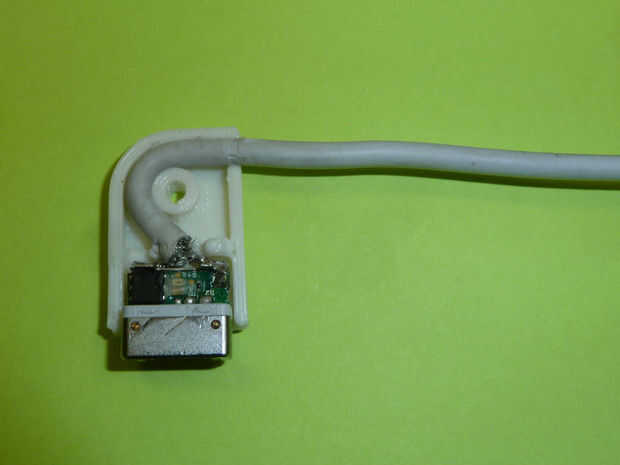 El conector es montado en el extremo abierto de la cáscara, y el cable está envuelto ronda el puesto interno, entonces hacia fuera a través de la esquina. La imagen del espejo se añade la mitad y un 3/8" #4 autorroscante tornillo sostiene las dos mitades juntas.