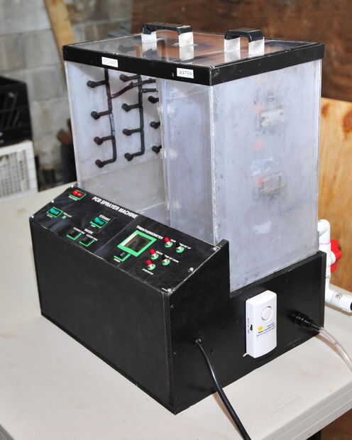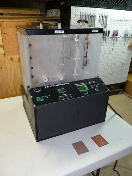 Me gustaría presentarles mi Máquina de proyección de tablero de circuito impreso que cualquier persona con conocimientos básicos de la herramienta puede construir. Muchas personas han publicado y construido máquinas CNC. Incluso algunas impresoras 3D han comenzado a surgir. Infinidad de herramientas y dispositivos para la creación de proyectos han sido publicados en Instructables y a través de internet. Todos estos dispositivos utilizan circuitos y más se pueden crear utilizando un PCB. Sin embargo, ido son los días donde uno necesita una bandeja sucia y necesita pasar casi media hora que les. El rociador de PCB produce en menos de 2 minutos, puede producir PCB múltiples a la vez, continuamente producen ellos y luego limpiarlos después. Es como una pequeña fábrica en su taller. Esta máquina es una gran adición a la tienda de cualquier fabricante y es una explosión absoluta de construir. Puede producir de PCB en demanda con facilidad y no tiene que gastar miles en una máquina industrial. ¿Dónde puede mejorar su madera, plástico, eléctrico, plomería y habilidades de dibujo?