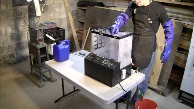 4) cuidadosamente vierta solución de grabador en depósito.