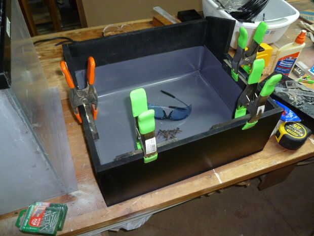 6) una vez que la caja esté completamente montada, corte forro de PVC a la forma apropiada. Asegúrese de que encaja en el cuadro Aplicar pegamento a la caja e Inserte el trazador de líneas. Una vez que el pegamento haya secado lo suficiente como para que no se balancee, utilice Goop en las esquinas para asegurar que ningún líquido puede deslizarse a través de.