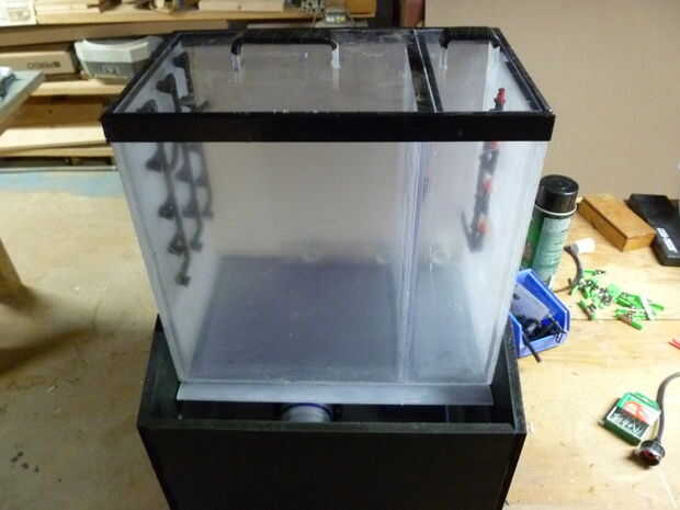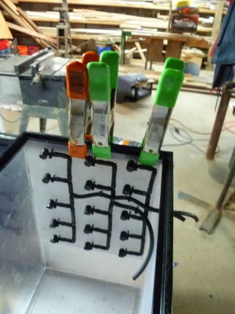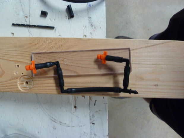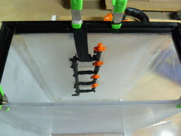 7) los rociadores de agua son un proceso similar pero sólo utilizamos una tira de acrílico como van en una línea. Siga el mismo procedimiento y asegure ambos al lado del tanque de limpieza.