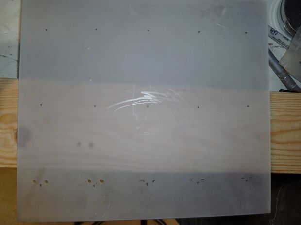 1) Comencemos con el rociador de grabador primero. Cortar la hoja de acrílico rociador (9 1/2 "x 10 1/2") marca los agujeros que posteriormente se perfora (pero no) en la hoja de acrílico (hice una fila o rociadores para ayudar a decidir dónde marcar los agujeros).