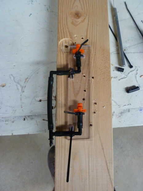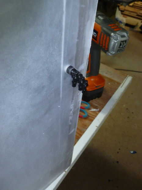 8) una vez que todos los pulverizadores son en el tanque, taladre los agujeros para la tubería que suministrará el rociador de líquido. Coloque una esquina de 90 grados en el y que no hay ningún exceso de tubo y que quede a ras con el borde del tanque.