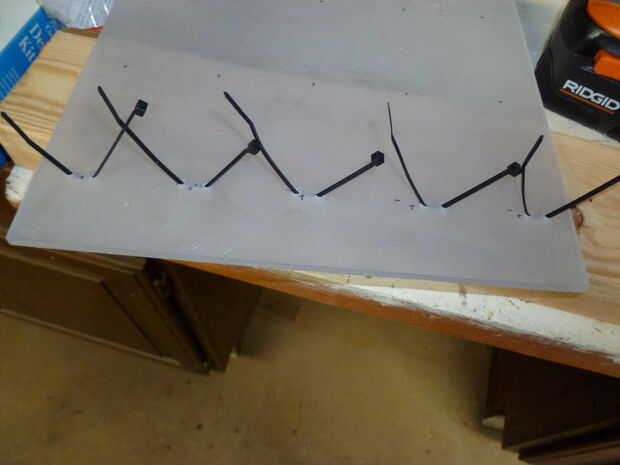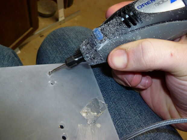 4) usando la herramienta rotatoria con algún tipo de broca pequeña ruta, ruta poco canales conectando cada par de agujeros en el lado opuesto del acrílico. Estos existen para que las bridas no se peguen hacia fuera la parte posteriora que no nos permita pegar al tanque más tarde.