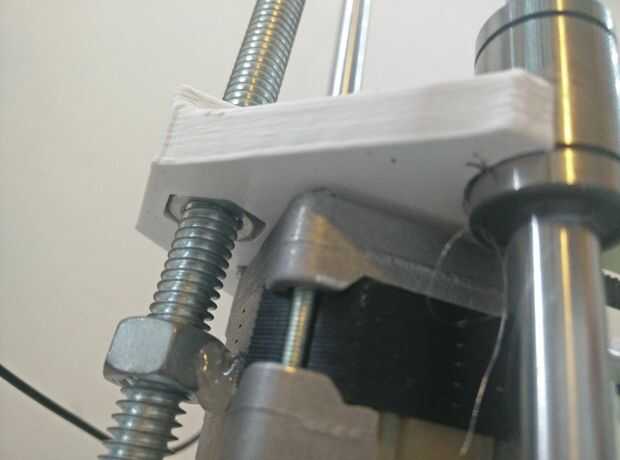Permite trabajar sobre el eje Z. En primer lugar permite comenzar con la pieza de estabilizador. Monte la pieza de estabilizador para el motor de eje Z con dos M3 * pernos de 10mm. Luego empuje las barras lisas de 8mm a través de los dos orificios paralelos en la parte delantera. Después de eso, poner una tuerca a través de la varilla roscada a mitad de la varilla.
