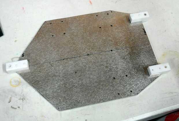 Una vez tenía todo resuelto en el modelo CAD transferí las líneas de corte y agujeros a la placa del tren de aterrizaje luego corte y lo perforaron a. Comencé con la marca la línea central a través de los orificios existentes y había medido todo desde allí. Cortar la placa con una sierra de banda, pero puede utilizar una sierra de calar o incluso una sierra para metales para hacer recta corta en aluminio. Los bordes pueden limpiarse con un poco de papel de lija o un archivo. Fácil-peasy lemon squeezy!