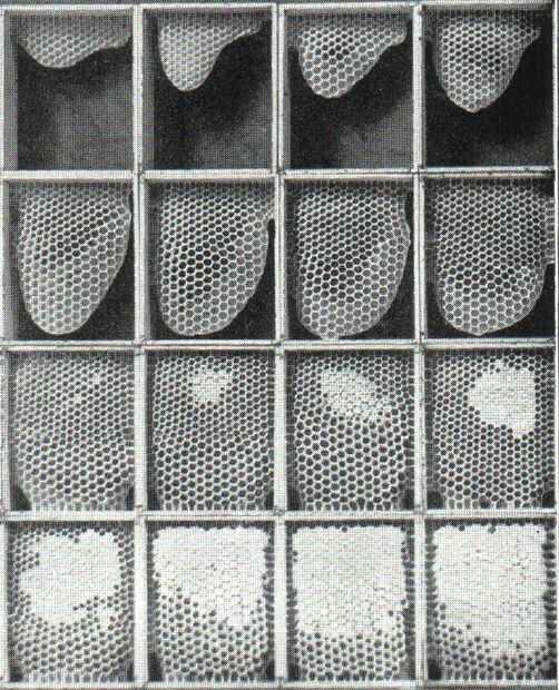 La fórmula química de la cera de abejas es C15H31COOC30H6I y contiene más de 300 componentes químicos individuales, incluyendo el palmitato, palmitoleato, ésteres de oleato y de alcoholes alifáticos de cadena larga. Este biopolímero es similar a otros termoplásticos principios utilizados por los seres humanos antes de uso, incluyendo látex, goma laca, gutapercha, cuerno y Carey más tóxicos y persistentes basados en petróleo plásticos. Impresión abejas en hexágonos con una desviación de 2mm, los hexágonos deforman gradualmente en círculos. Hexágono y el círculo son casualidad, sino el resultado de millones de años de ensayo y error a través de la evolución, las formas siendo la más eficiente y más fuerte de cualquier material debido a su resistencia a la tracción y una reducida superficie en general. Esto permite mantener más de 50 veces su propio peso en miel, el polen y las abejas en forma de panal.