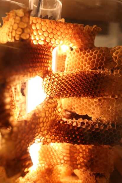 Piensa en esto: las abejas construyen sus casas, viveros y fábricas de un plástico biológico que es fabricado por sus propios cuerpos, utilizando su propia temperatura corporal y la química del cuerpo, con un material que es reutilizable y no plantea ninguna demanda en otros ecosistemas o recursos. Panal es casi descolorido cuando primero formado, pero con el tiempo adquiere más color con oxidación, actividad del ciclo de vida de abeja y contacto con los granos de polen.
