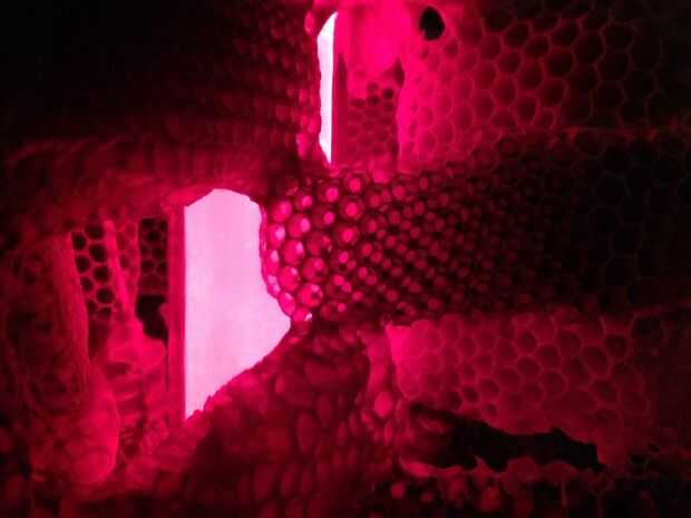 Este tubo de luz se convierte en parte de la estructura interna de la impresión 3D y brillará blanca una vez retirada la impresión. Una característica fundamental aquí además del color es que el calor de las luces será ventilado fuera de los espacios, por lo que las abejas pueden ir sobre sus vidas sin necesidad de trabajar duro para enfriar el lugar.