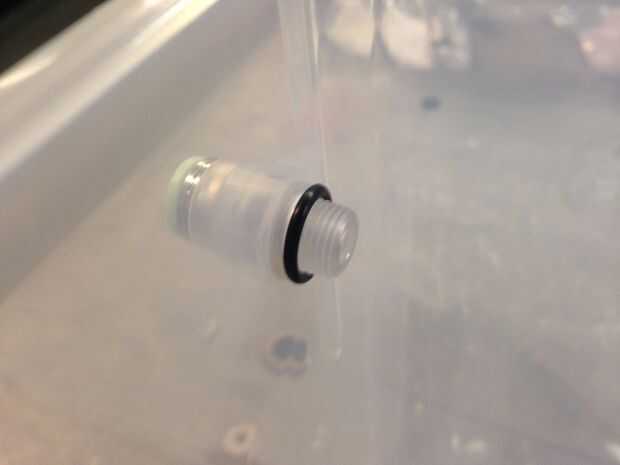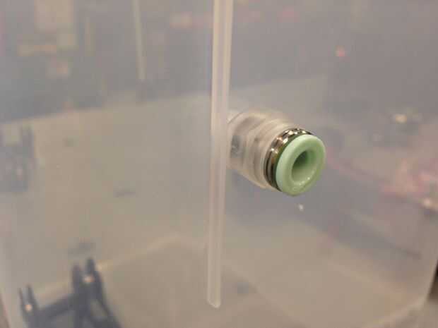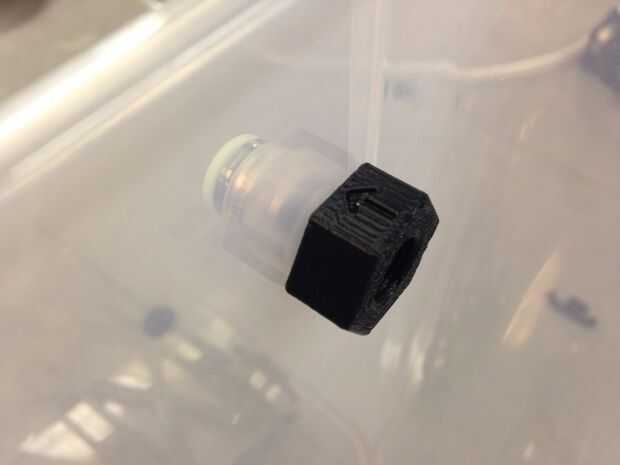 Coloque el carrete en el portacarretes y una ruta de salida adecuado para el filamento a través de la pared de la cámara de la vista. Suavemente taladre un agujero con el taladro de 10mm. Pase la conexión empujar-a-conecta roscado por el orificio y en la cámara y la junta tórica 012 sobre las roscas de plástico. Con las flechas en el lado orientado hacia la conexión, enrosque la tuerca BSPT en el montaje y apriete contra el plástico de la pared de la cámara.