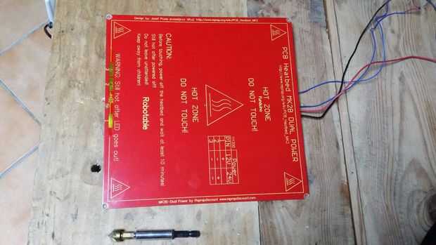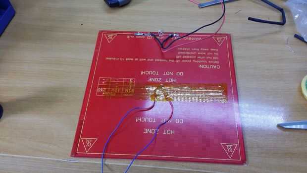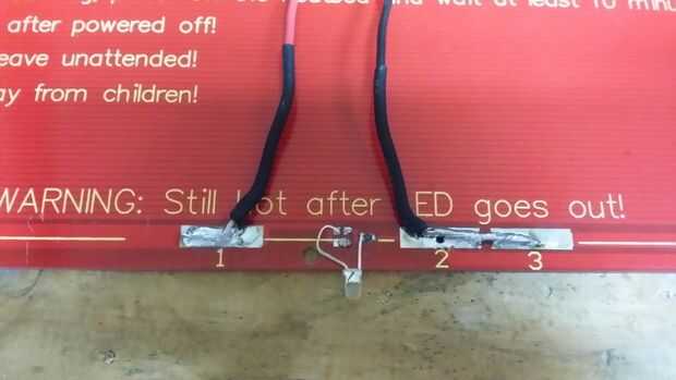 Para poner un cristal o un espejo sobre el semillero, he molido agujeros de semillero para introducir las cabezas de los tornillos... Entonces yo he soldado un cables de led y de energía. El termistor se haya fijado en el centro de la cama con cinta de Kapton.