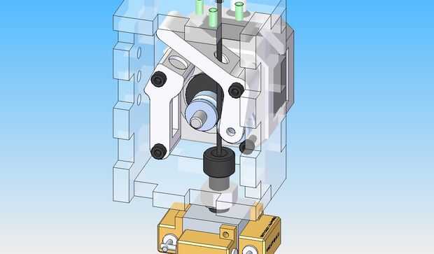 El montaje del motor empuja el filamento a través de la cabeza del calentador. El hub es un elemento de Makerbot, pero el tensor es personalizado. Estas piezas están diseñadas para ser impresos, utilizando Shapeways, o pidiendo a alguien que tiene una impresora. El filamento proviene la parte superior de la carcasa, y un resorte sostiene el eje ralentí al concentrador impulsado por motor. Usar un motor paso a paso para la alimentación de la extrusora permite mejor control de la hacia fuera-alimentación del filamento. Esto utilizaría el puerto A-eje de la electrónica de Makerbot.