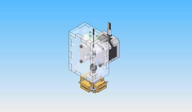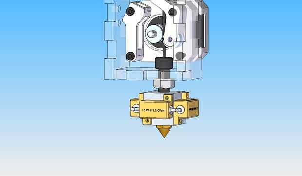 La resistencia real es un pequeño bloque de aluminio. Tiene una rosca de 5/16" en un extremo para recibir el tornillo de ventilación y un hilo en el otro extremo de la punta de la extrusora. Tres resistencias de potencia 15W Haz montados en el bloque de aluminio para proporcionar el calor para derretir el filamento.